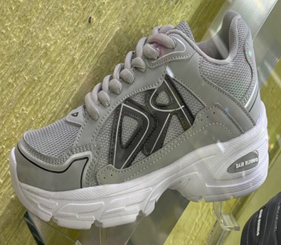 Tenis en combinación gris con suela blanca que aportan un estilo moderno y equilibrado. Ideales para un look versátil con un toque más sutil, pero igual de llamativo.